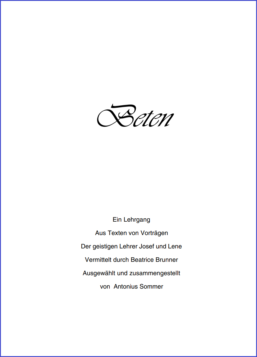 Beim Aneinanderfügen der Ausschnitte ist im Wesentlichen die zeitliche Reihenfolge beibehalten worden, in der die Belehrungen gegeben wurden. So wird der Aufbau eines „Lehrgangs“ erkennbar, den die geistigen Lehrer in die Vorträge zu jeweils anderen und ganz verschiedenen Sachthemen kunstvoll eingeflochten hatten. Deutlich wird dabei auch, daß die geistigen Lehrer die vielfältigen Aspekte des Betens immer wieder aufgreifen und jeweils wieder unter etwas anderem Blickwinkel darstellen, was offenbar auch einem System folgt - hier ist eine Lehrsystematik maßgebend, die den langsamen, umfassenden Erkenntnisaufbau der damaligen Zuhörer wie der heutigen Leser im Auge hat; die dahinter[1]liegende Sachsystematik wird dem aufmerksamen Leser nach eingehender Kenntnis des Ganzen sicher nicht entgehen.